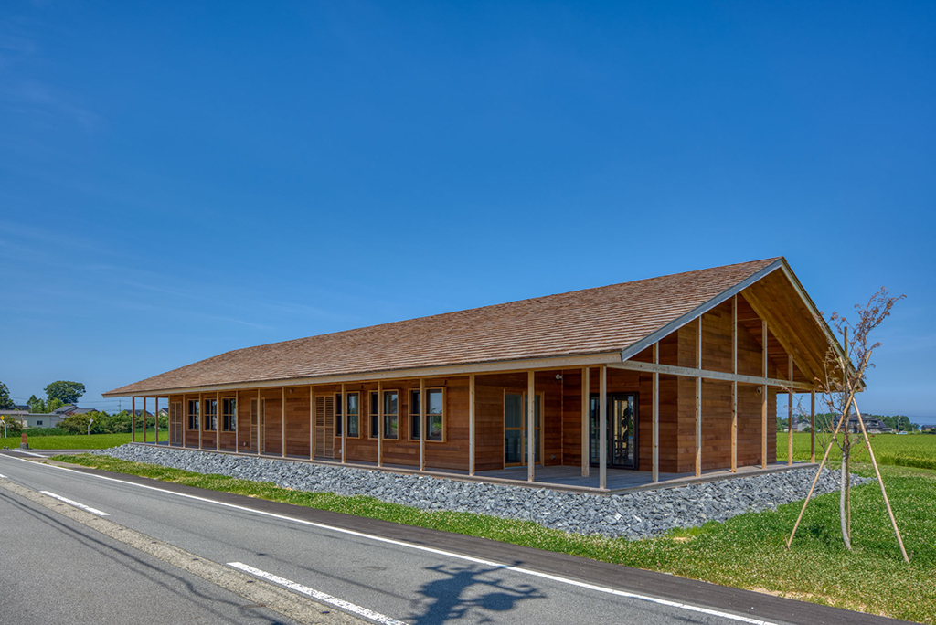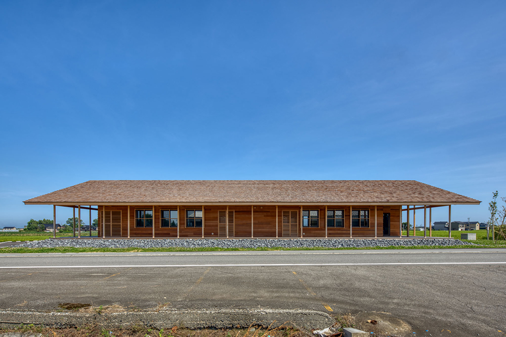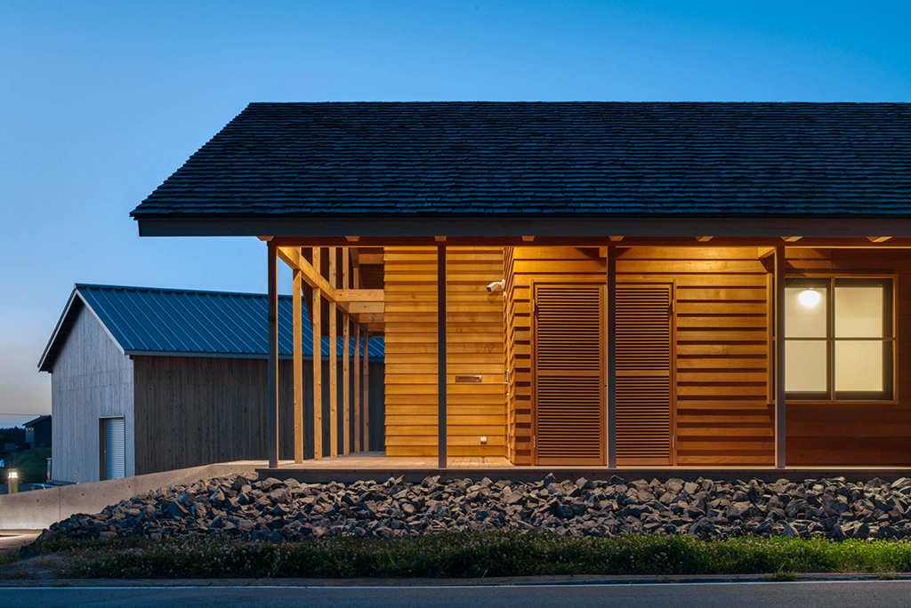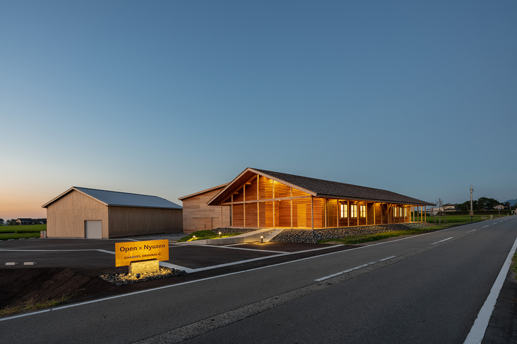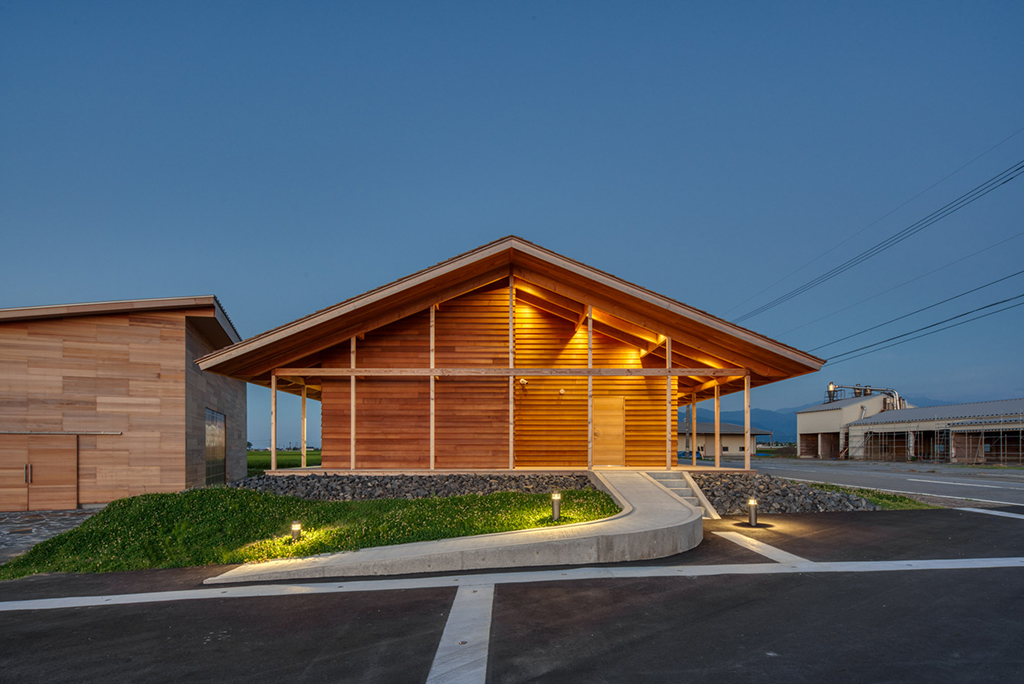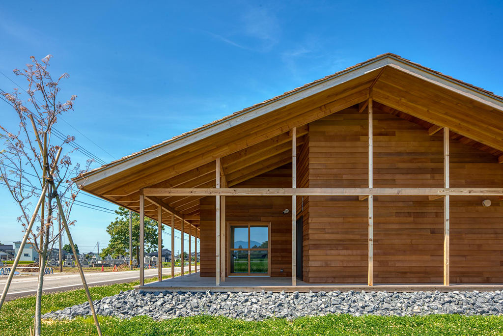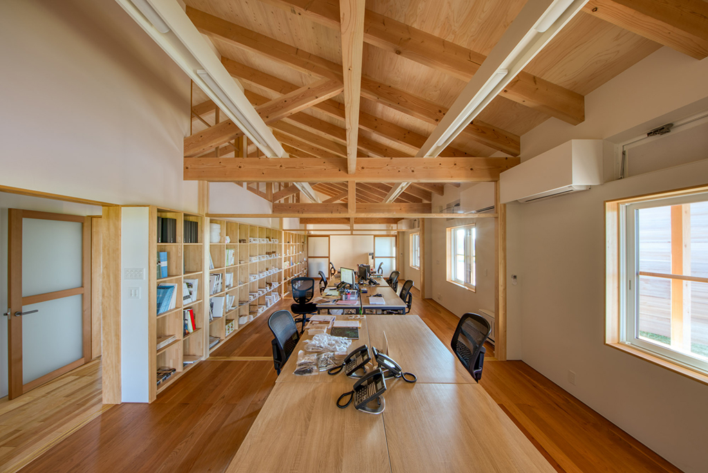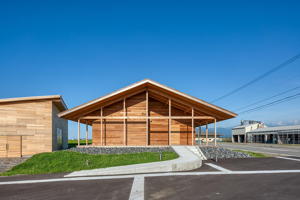 建築資材サプライヤーカンパニーのための富山に建築した北陸事務所。 屋根・外壁・床・デッキ等はチャネルオリジナルが扱う木材。 立山連峰を背景にした雄大な風景の中に建っている。