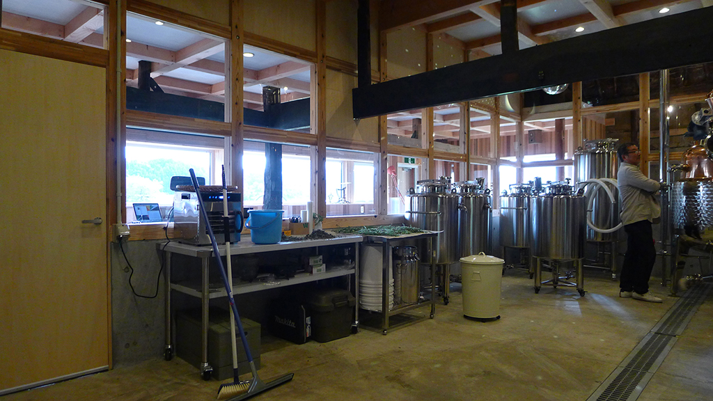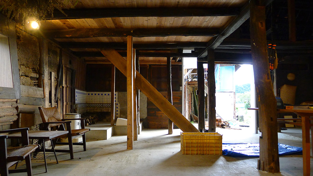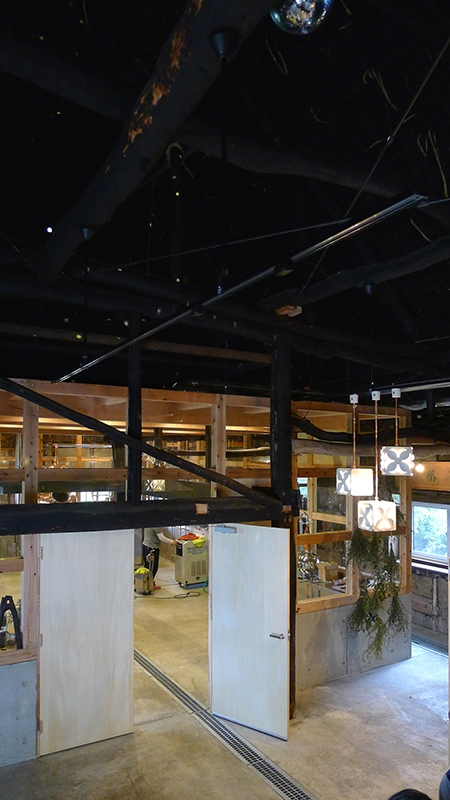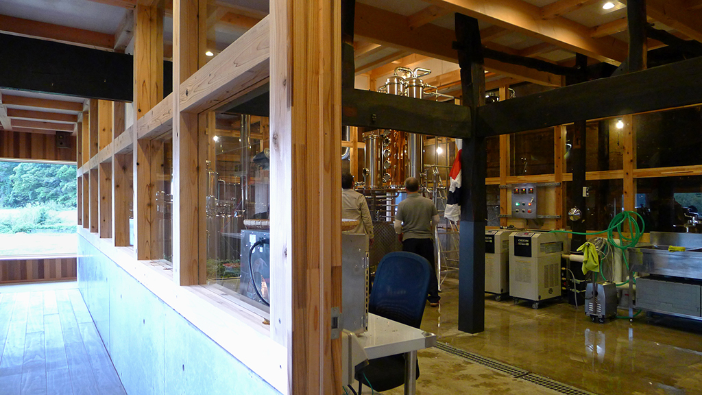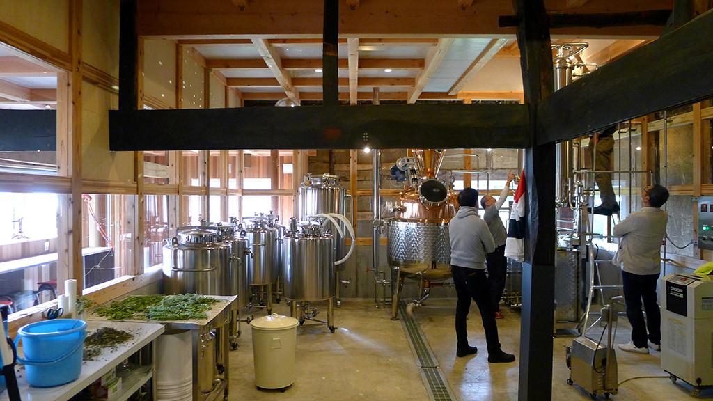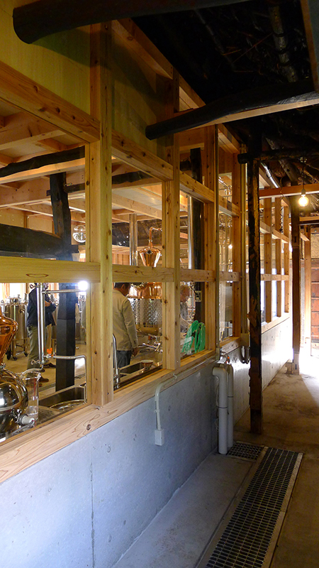 築140年の茅葺屋根の住宅をクラフトジンの蒸留所にリノベーション。 既存の柱・梁はかなりゆがんでおり、可能なかぎりの耐震補強を施し 入れ子状の新たな構造体を挿入。その空間を蒸留所(工場)とした。